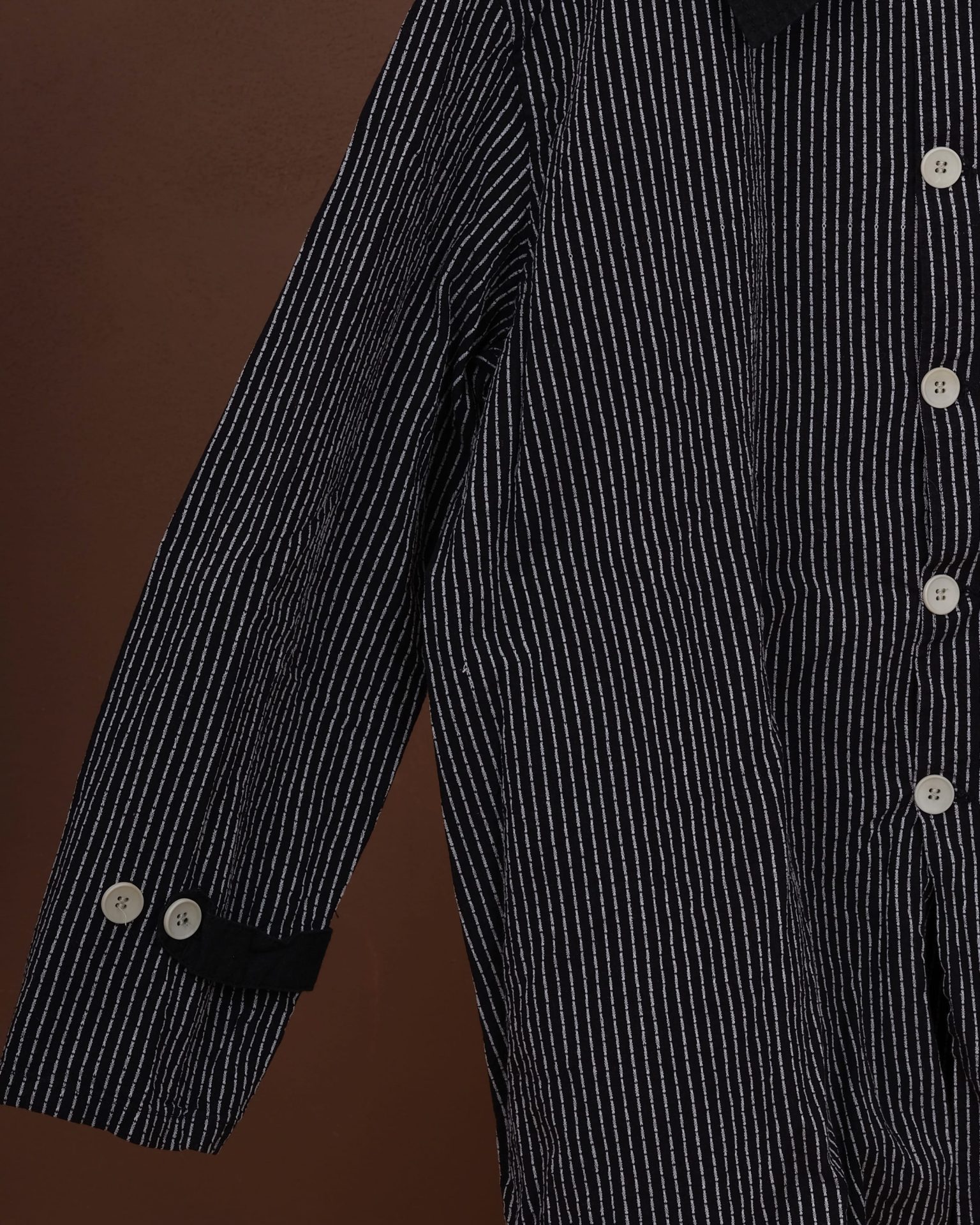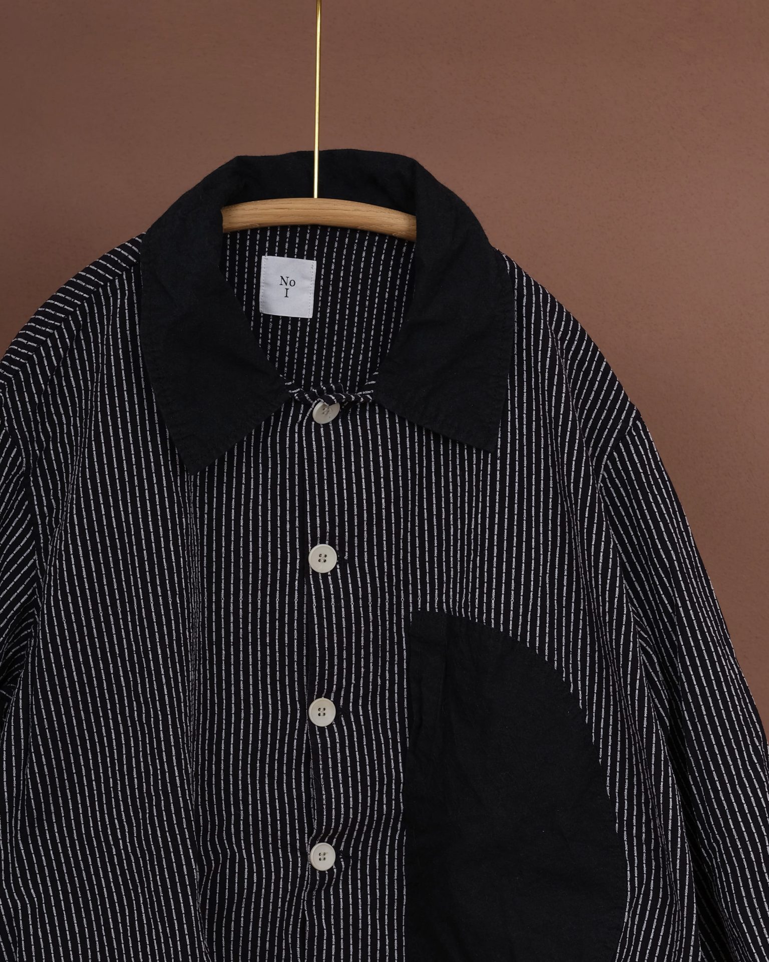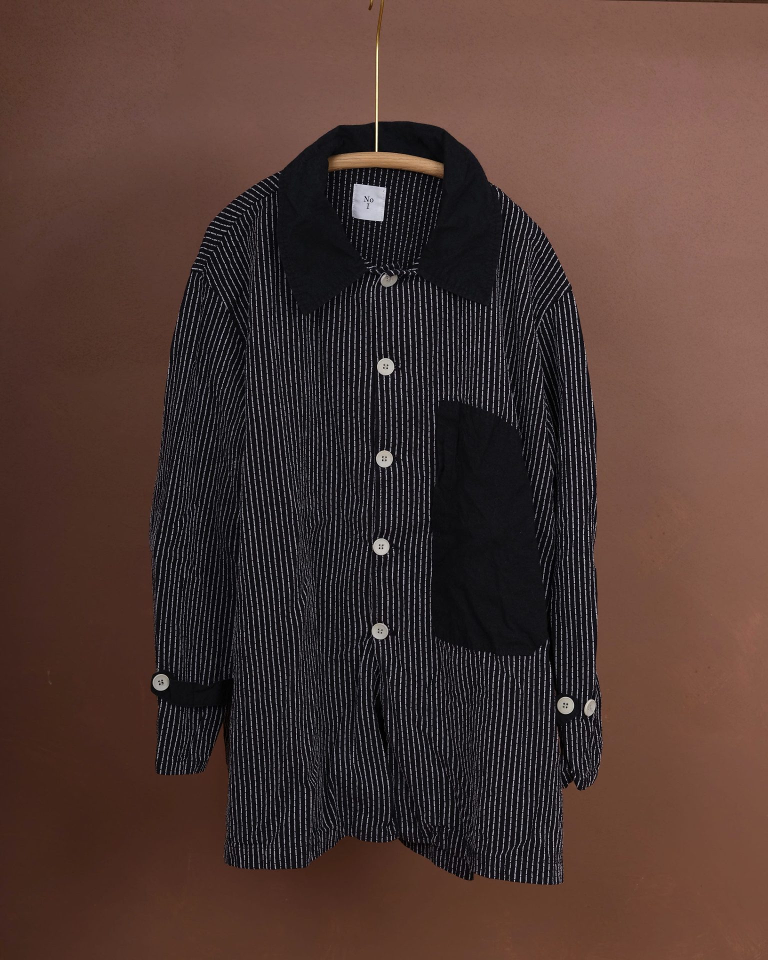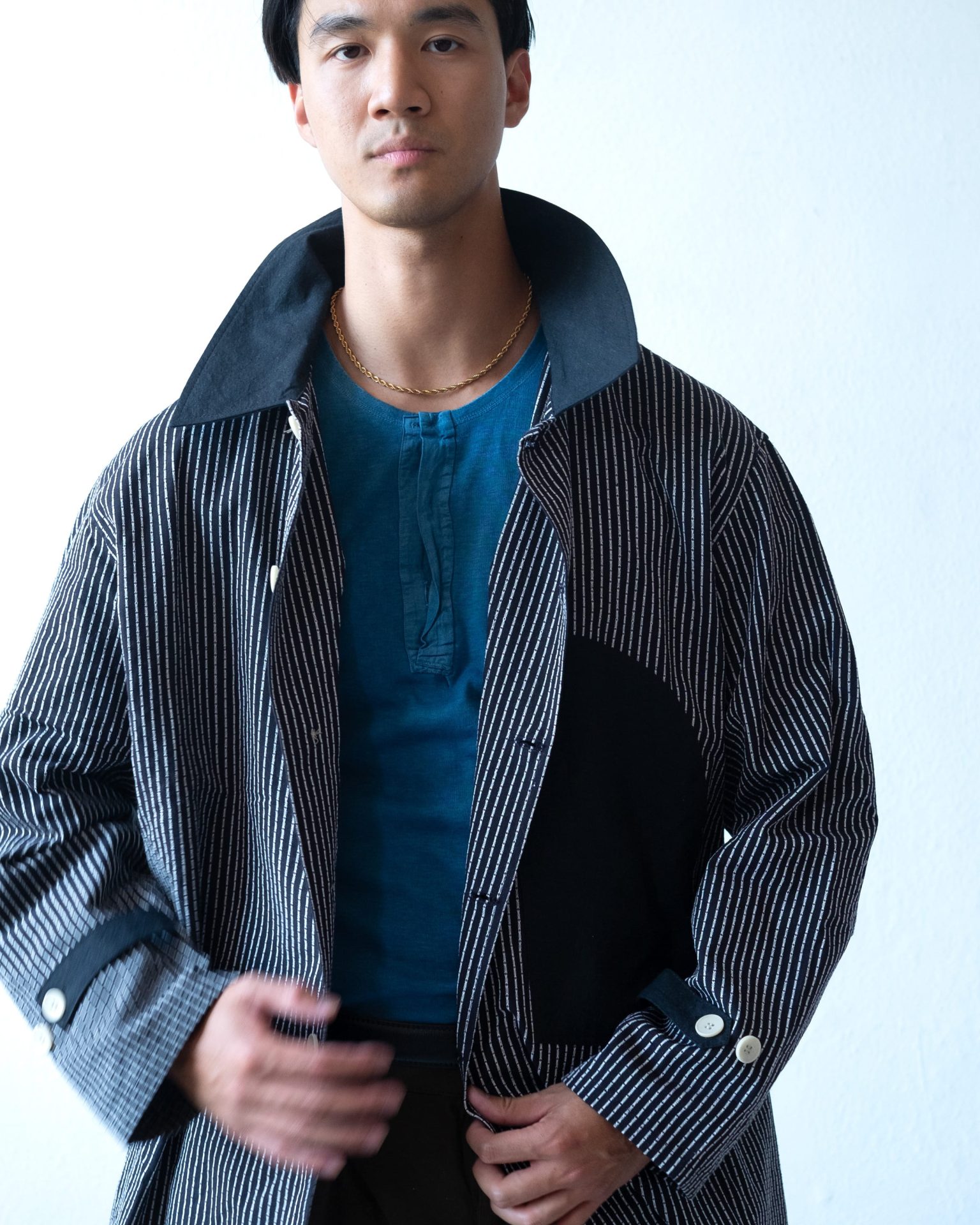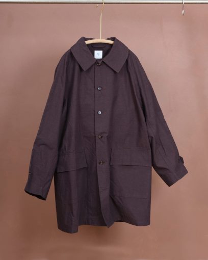 Our longest garment is inspired by shop keeper, teacher, chemist or military worker from 1940’s. We made them in different lengths and with different pockets configurations. Two large hand D pockets respectively only one when the coat is short. The overcoat is assembled with French seams, including sleeves. We used lightweight aluminium buttons.