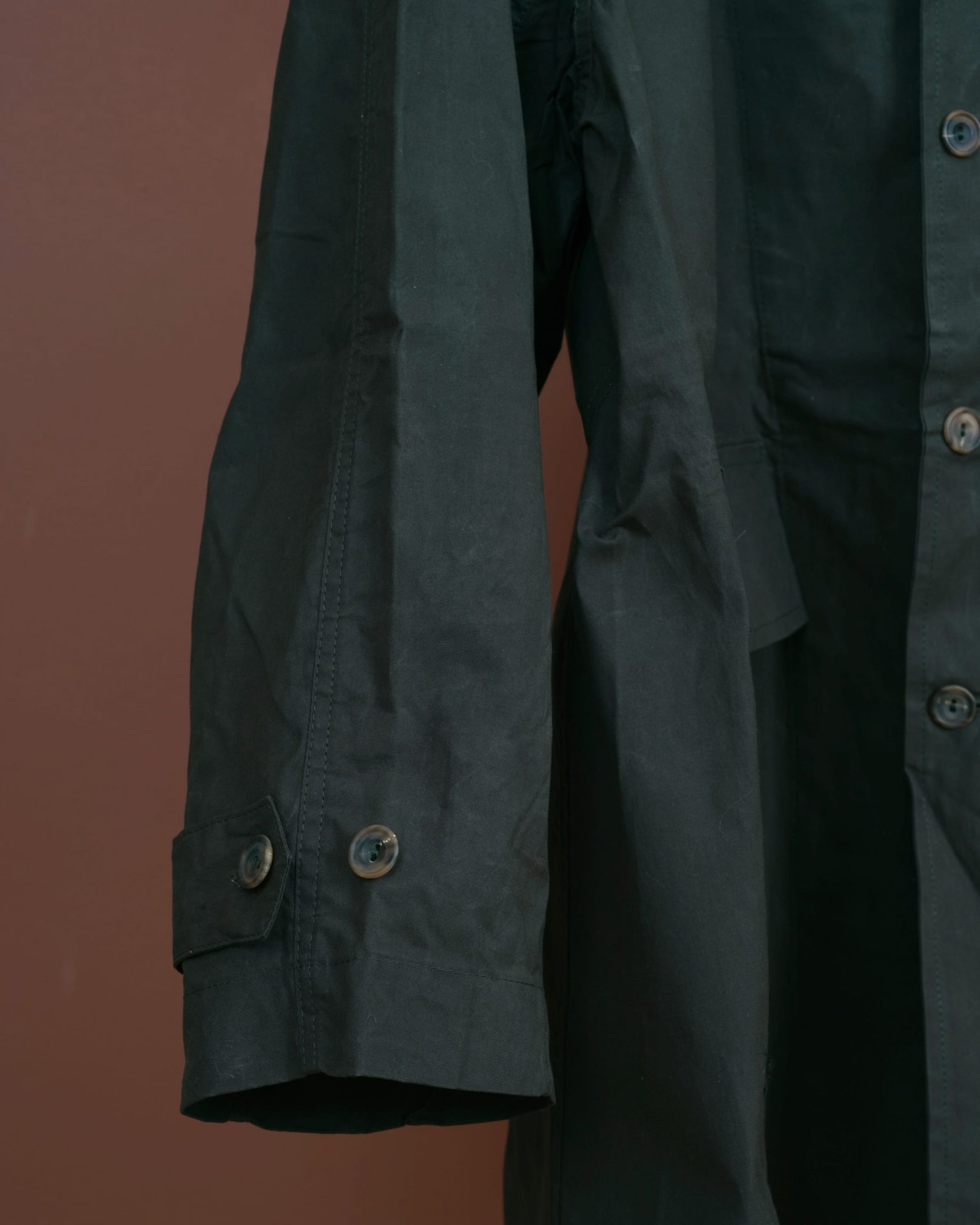 The Hunting Raglan Coat is an A shaped type and with loose fit. Two hand pockets with flaps and two sleeve belts. We used new old stock English horn buttons from the same era. The No I labels are woven on shuttle loom and are a beautiful touch. We couldn't compromise on this aspect. This variation is made of high density cotton fabric with lotus processing and is woven on shuttle loom in Shizuoka, Japan.
