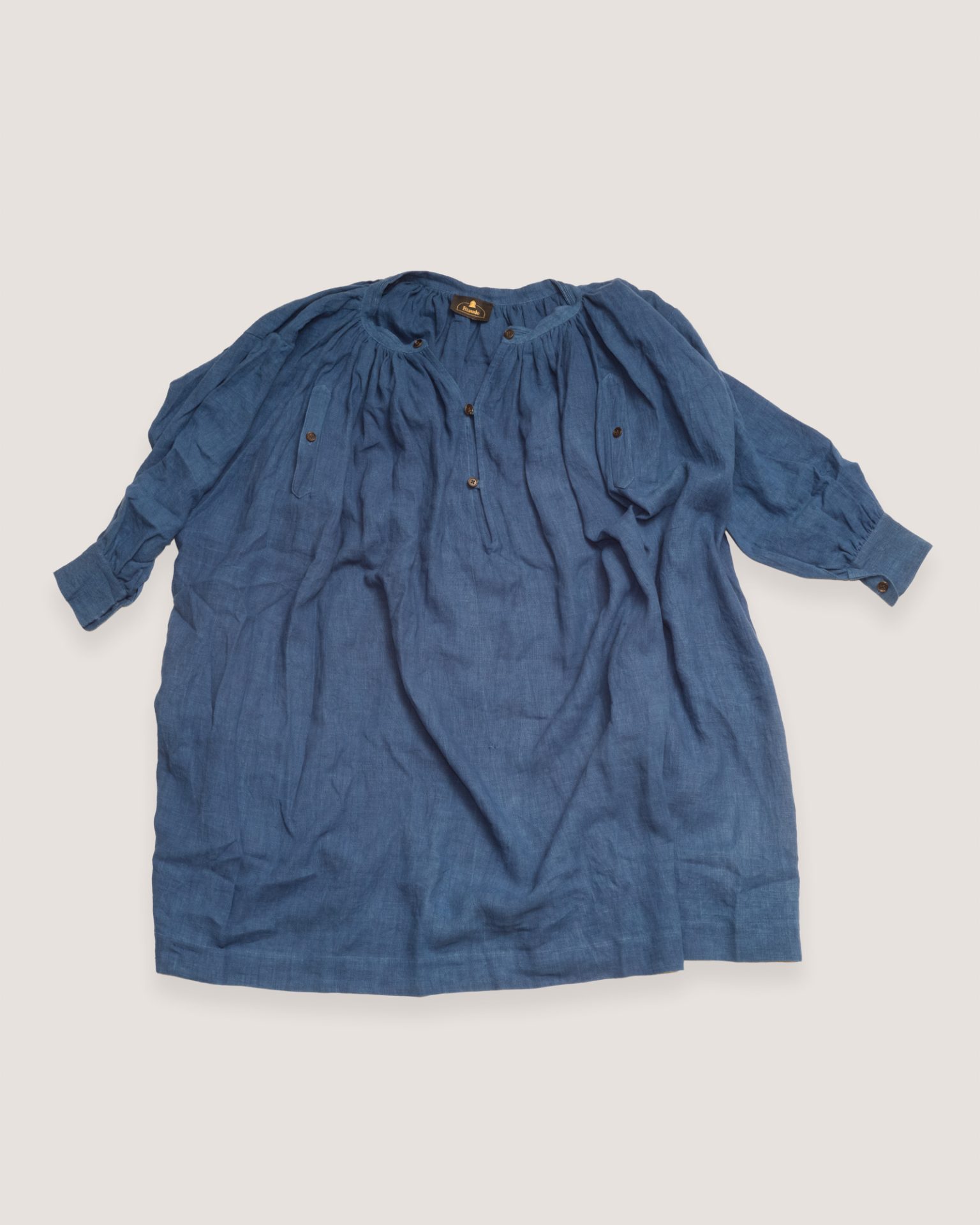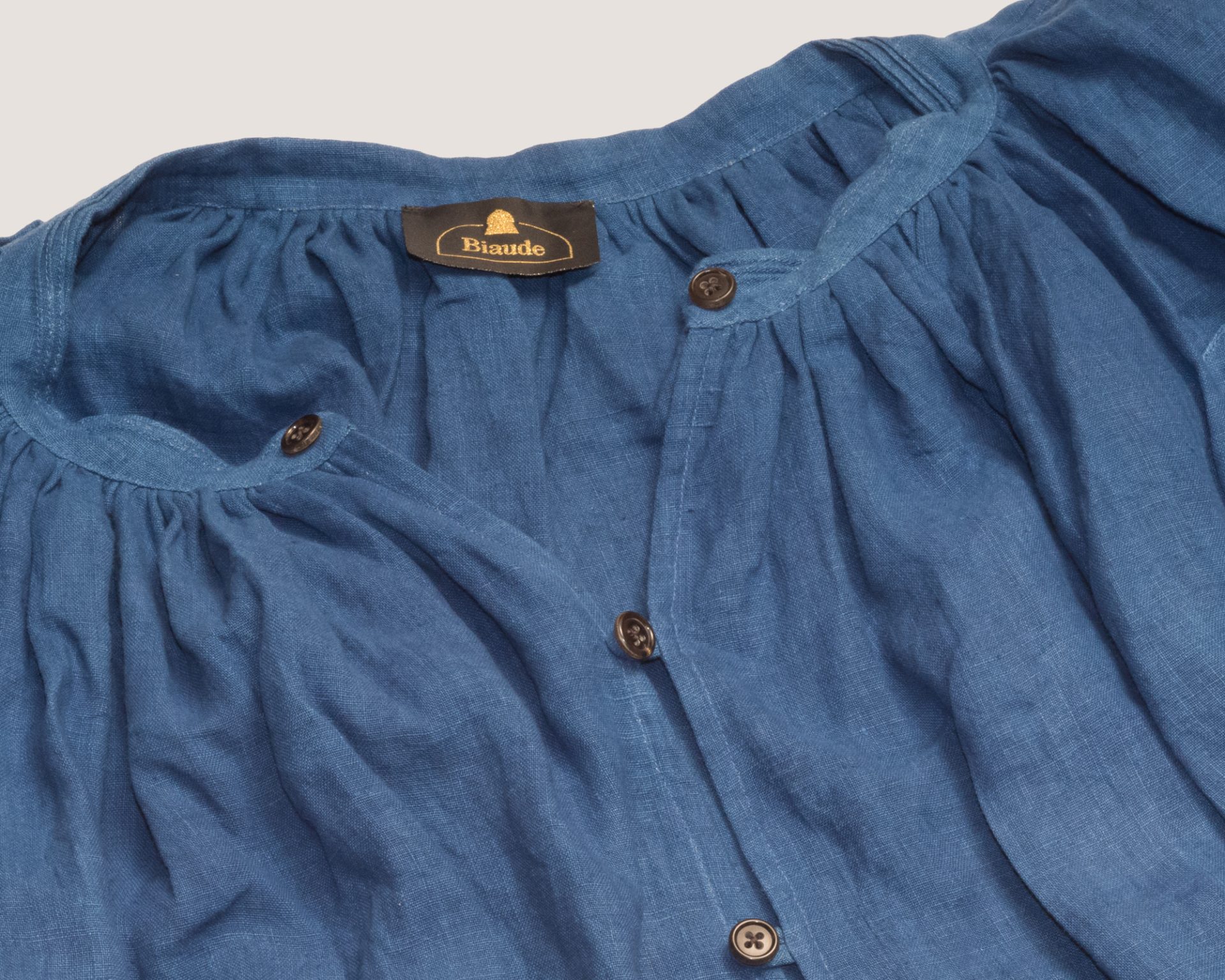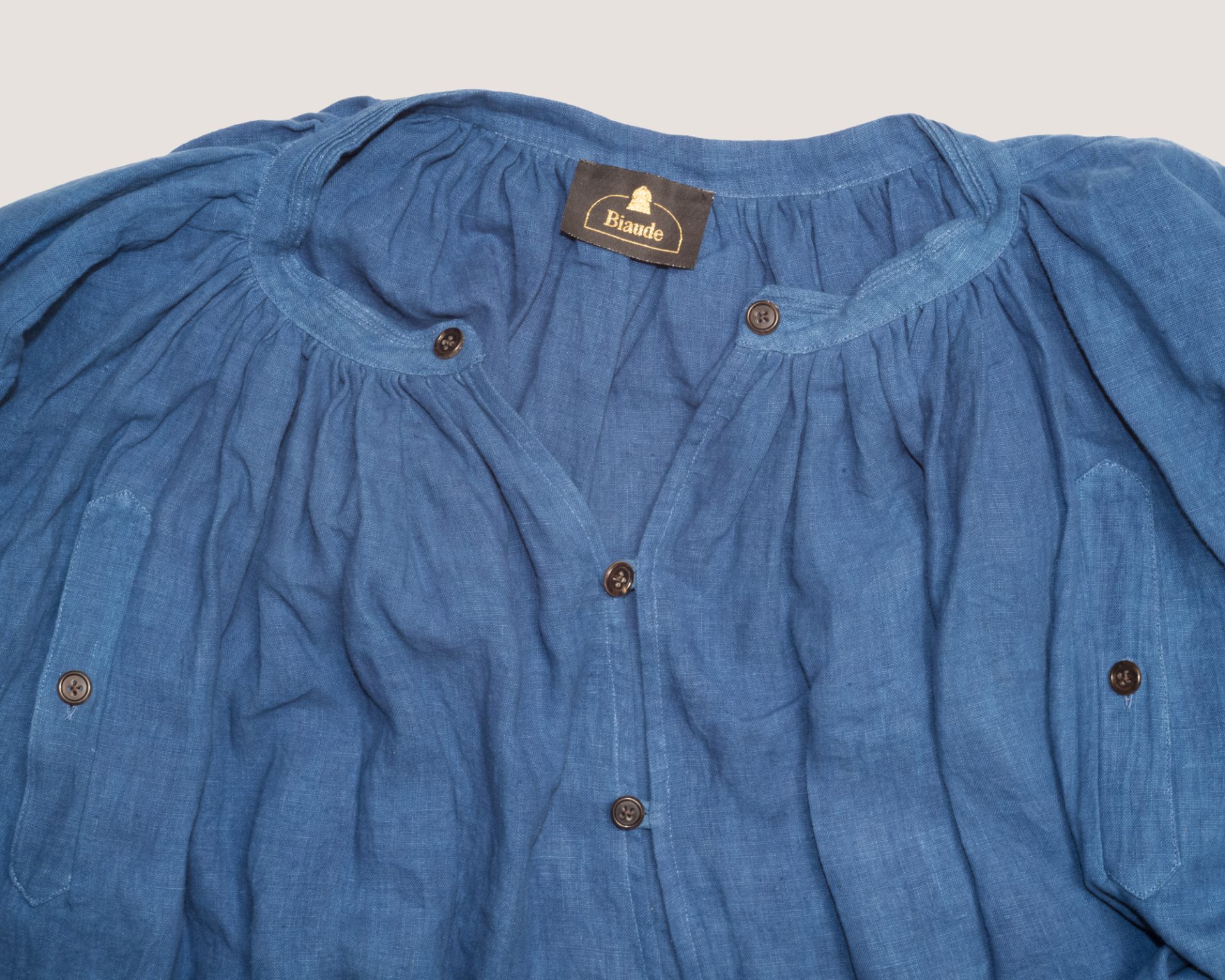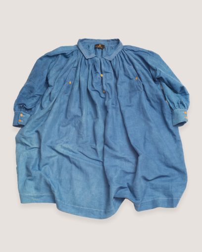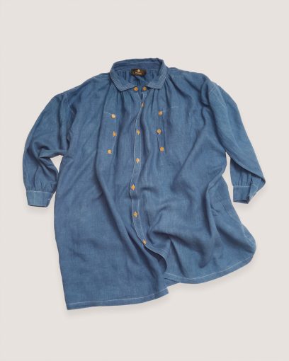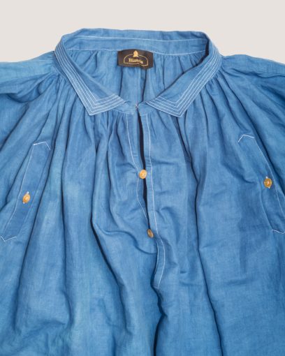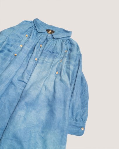 Ultra-wide smock that blends the versatility of a dress and the structure of a manteau, offering great freedom of movement. Lightweight and breathable, it accommodates all body shapes. The accordion pleats at the back create a flowing silhouette. Each Biaude is one of a kind, featuring a unique combination of collar, button designs, and thread colors. We used rare, new old stock British-made buttons from the 1950s, giving every piece a distinctive charm.