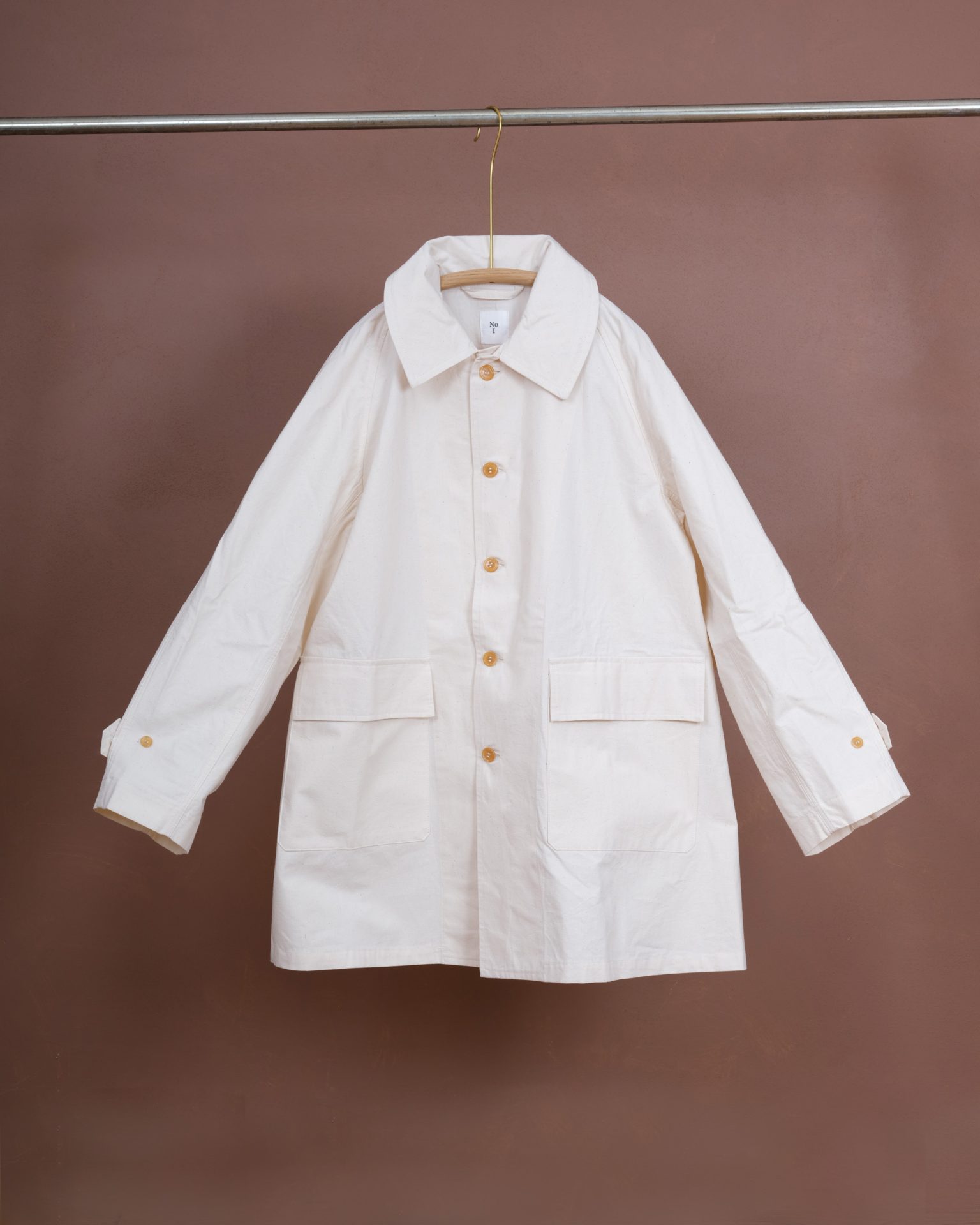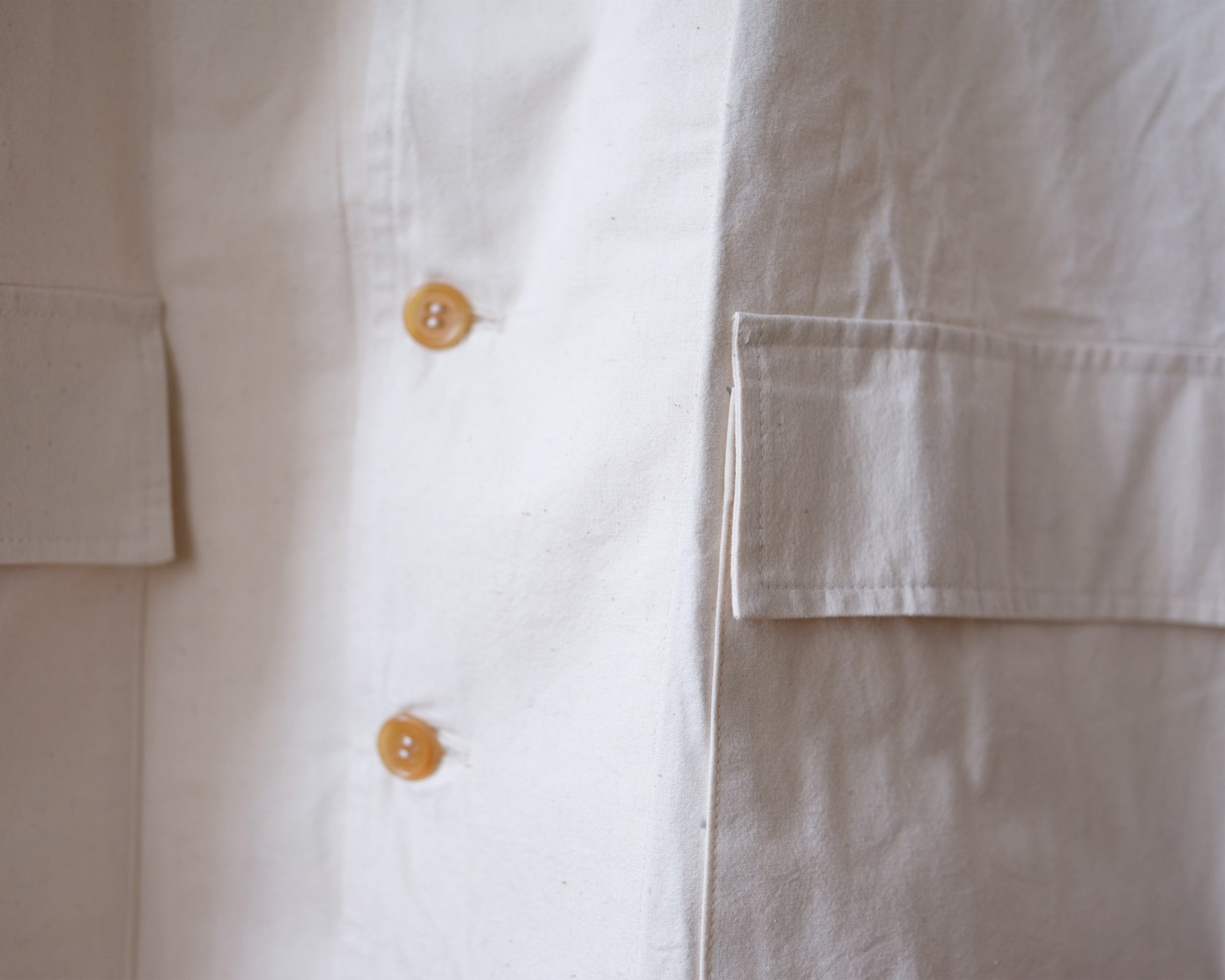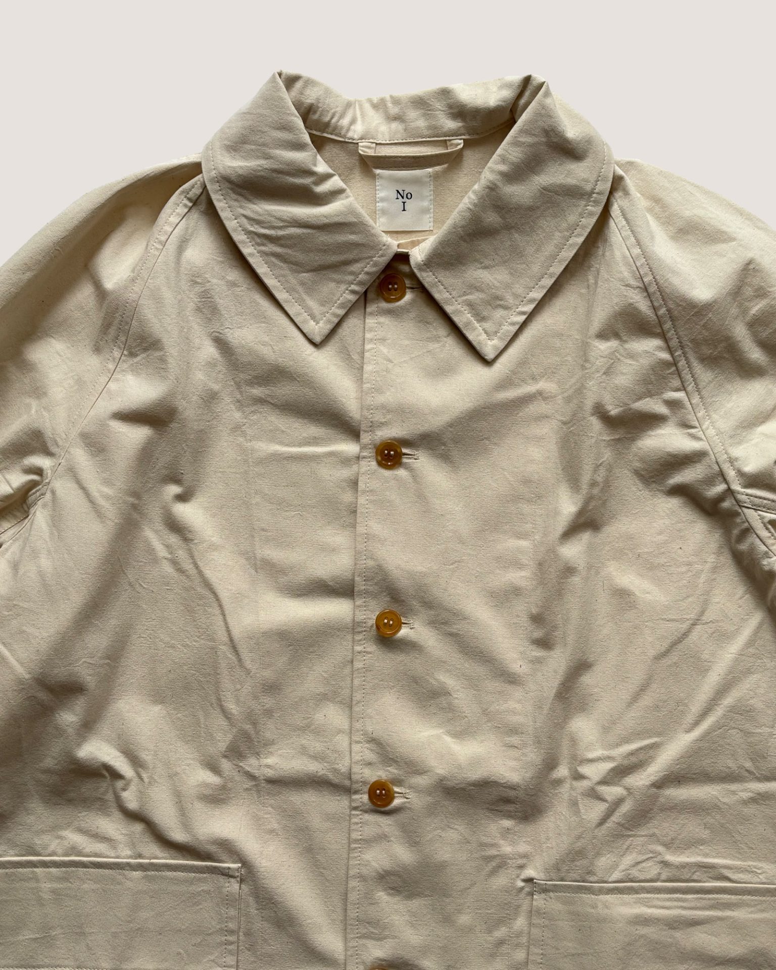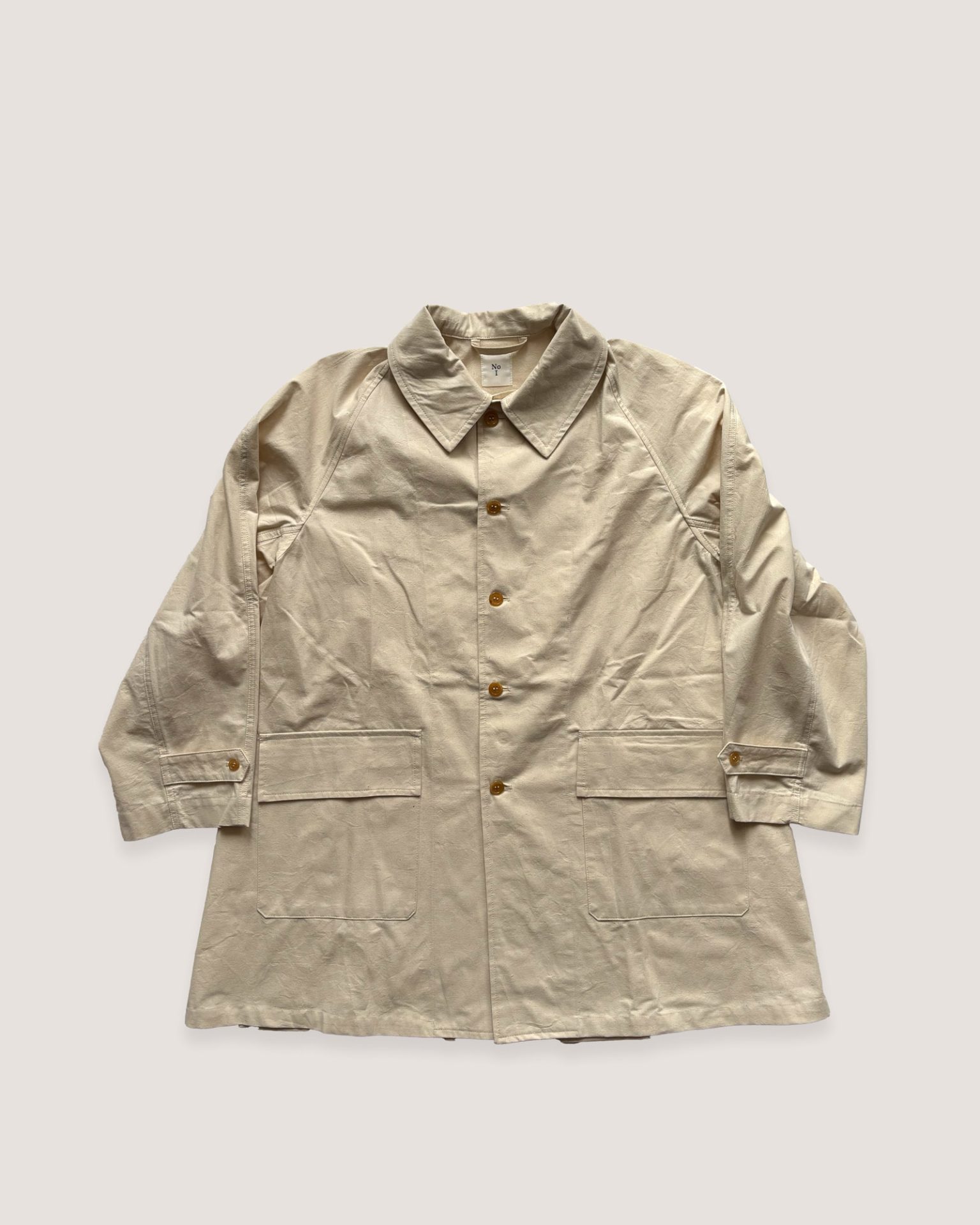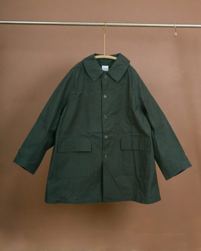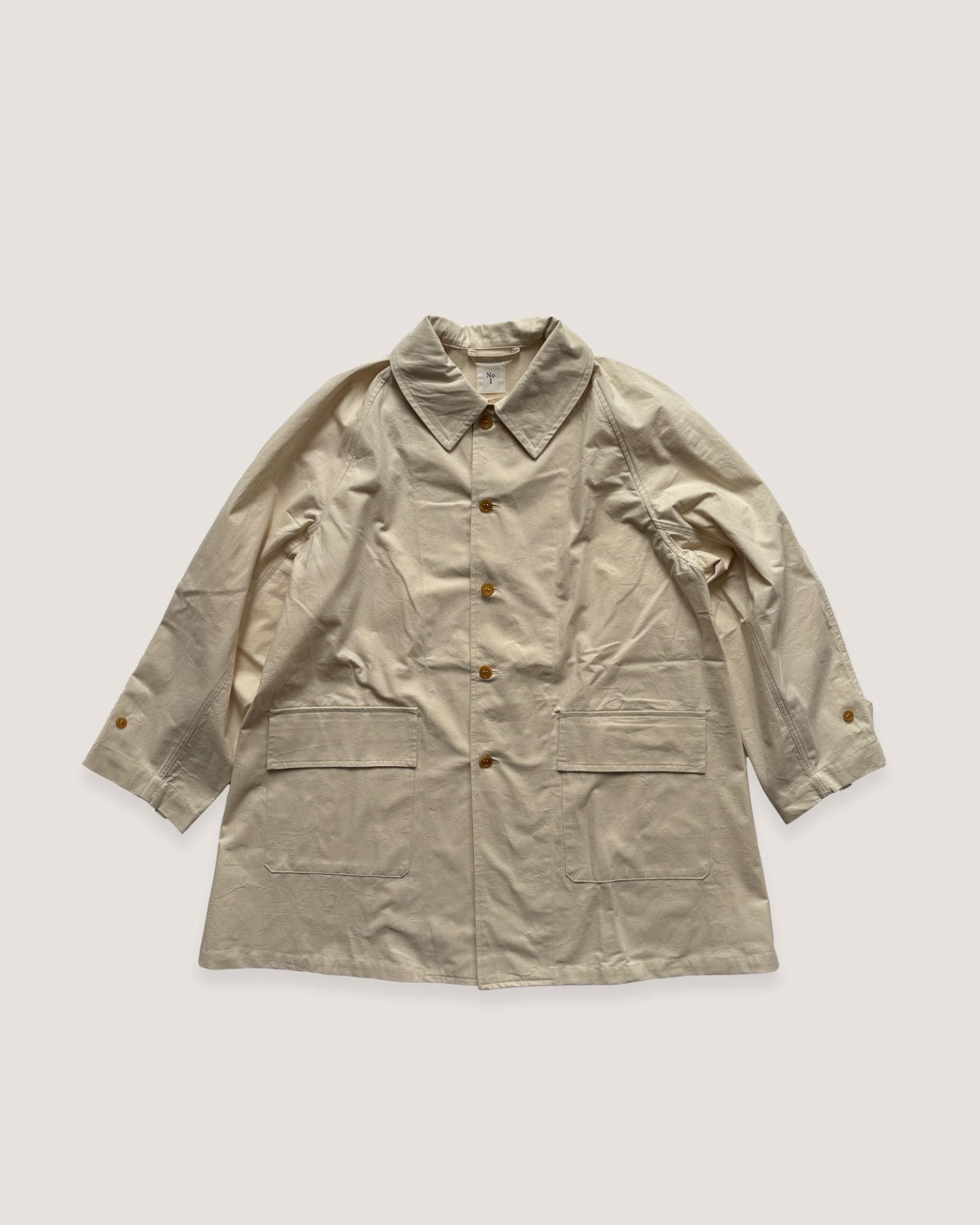 The Hunting Raglan Coat is an A shaped type and with loose fit. Two hand pockets with flaps and two sleeve belts. We used new old stock English horn buttons from the same era. The No I labels are woven on shuttle loom and are a beautiful touch. We couldn't compromise on this aspect. This variation is made of high density cotton fabric woven on shuttle loom in Shizuoka, Japan.