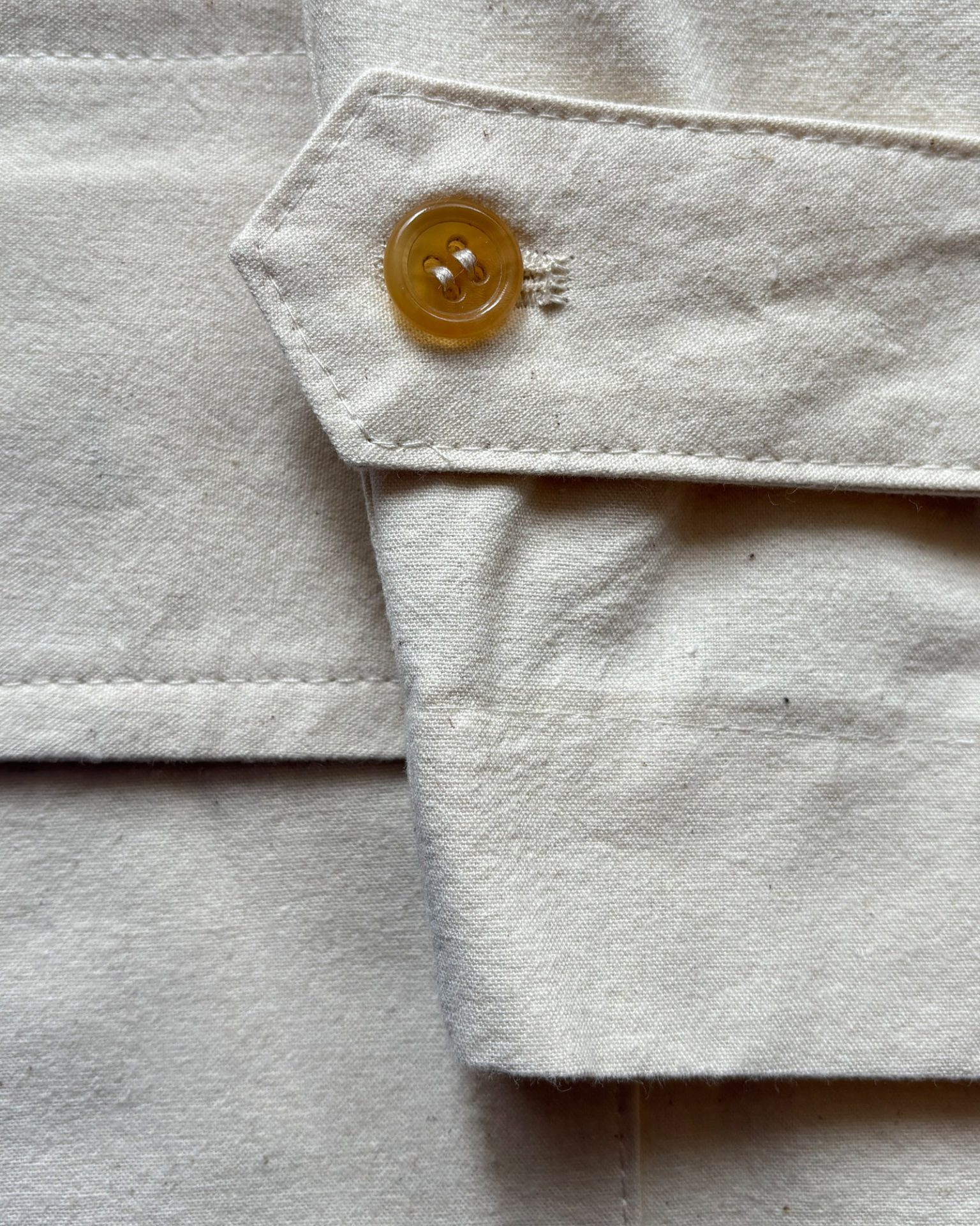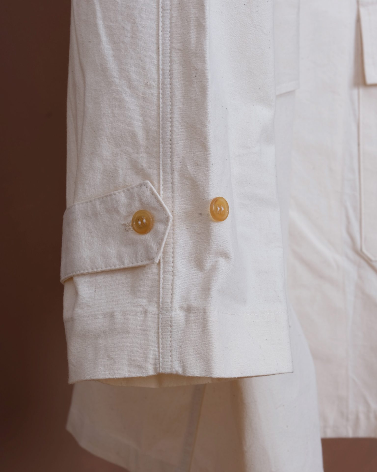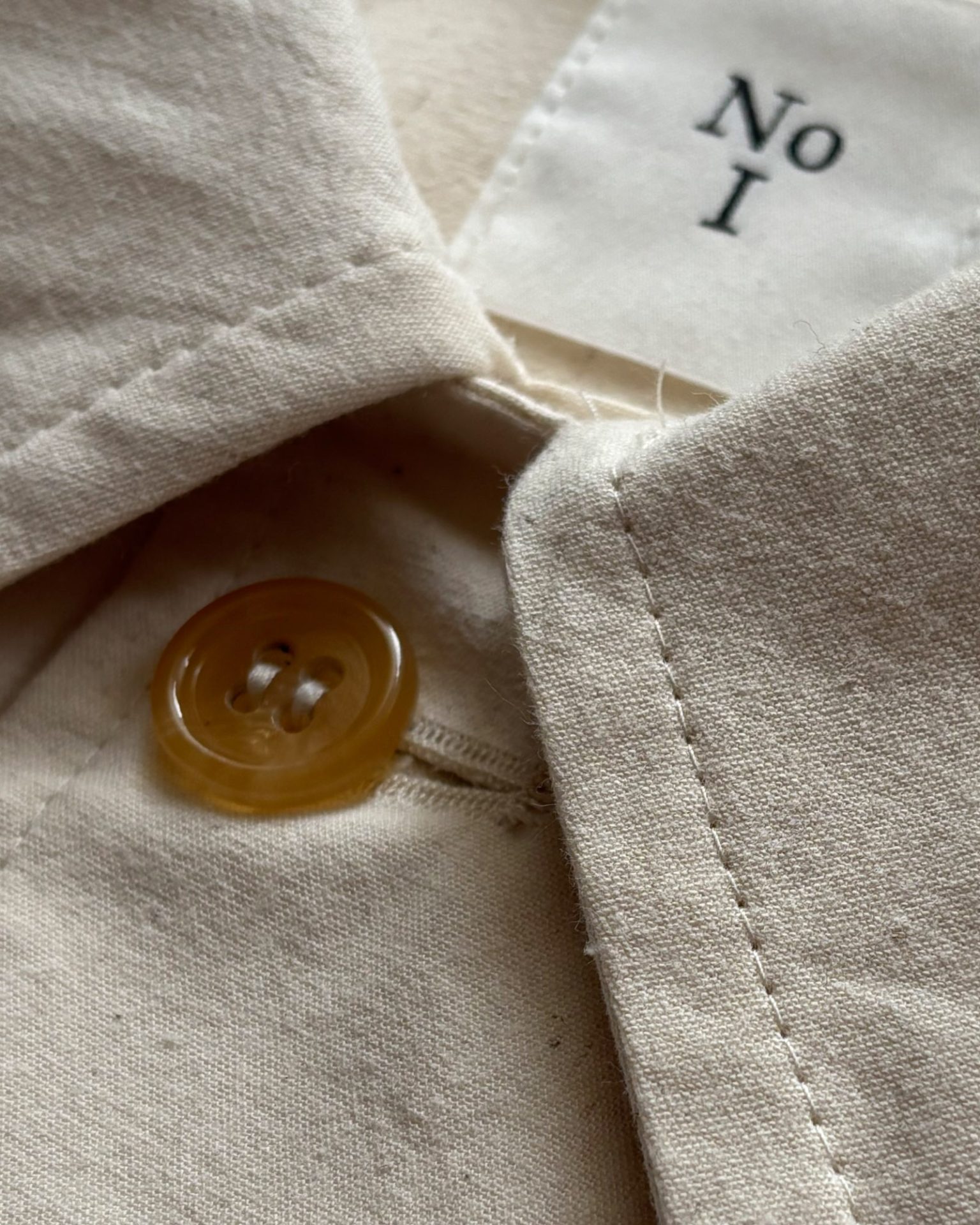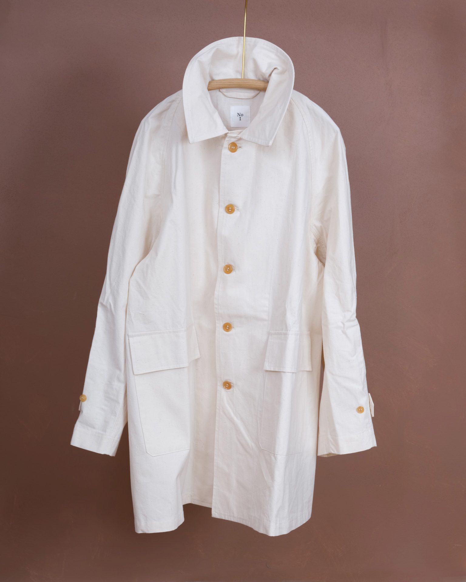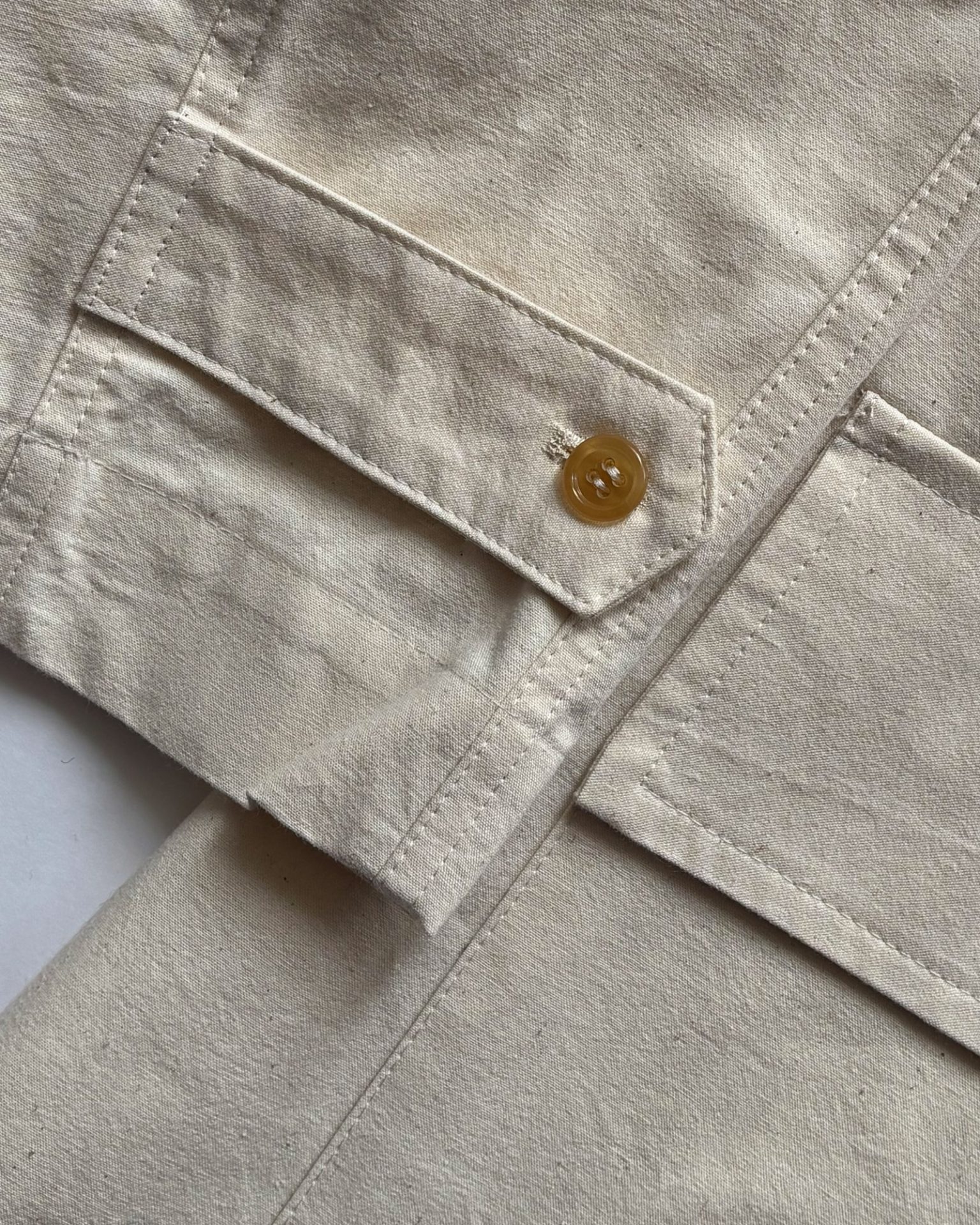 The Hunting Raglan Coat is an A shaped type and with loose fit. Two hand pockets with flaps and two sleeve belts. We used new old stock English horn buttons from the same era. The No I labels are woven on shuttle loom and are a beautiful touch. We couldn't compromise on this aspect. This variation is made of high density cotton fabric woven on shuttle loom in Shizuoka, Japan.