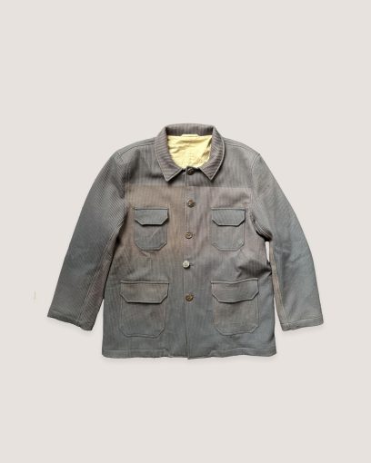 Based on the same fit as the Work Signature Coat, this robust coat is a solid outer garment. We offer this in lined or without lining versions, with different pocket flaps combinations. This piece is made of new old stock heavy corduroy cotton made in Holland in the 1940s and half sleeve made of old cotton moleskin. We used new old French animal buttons.