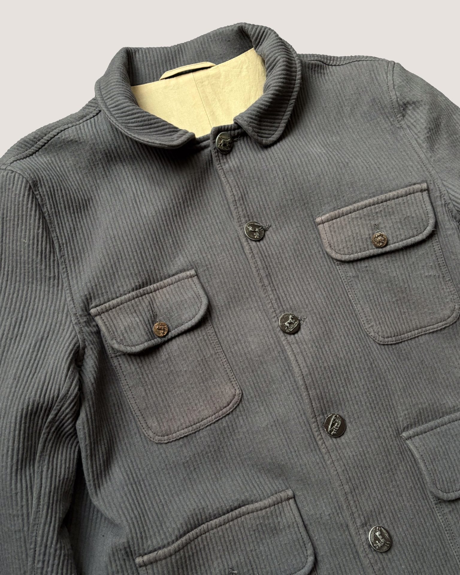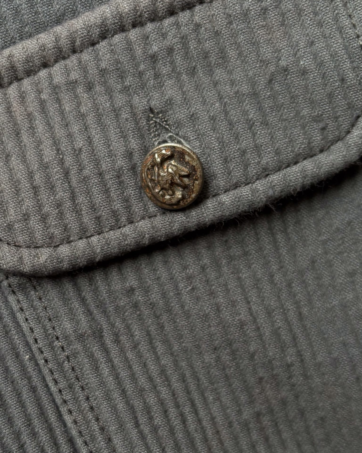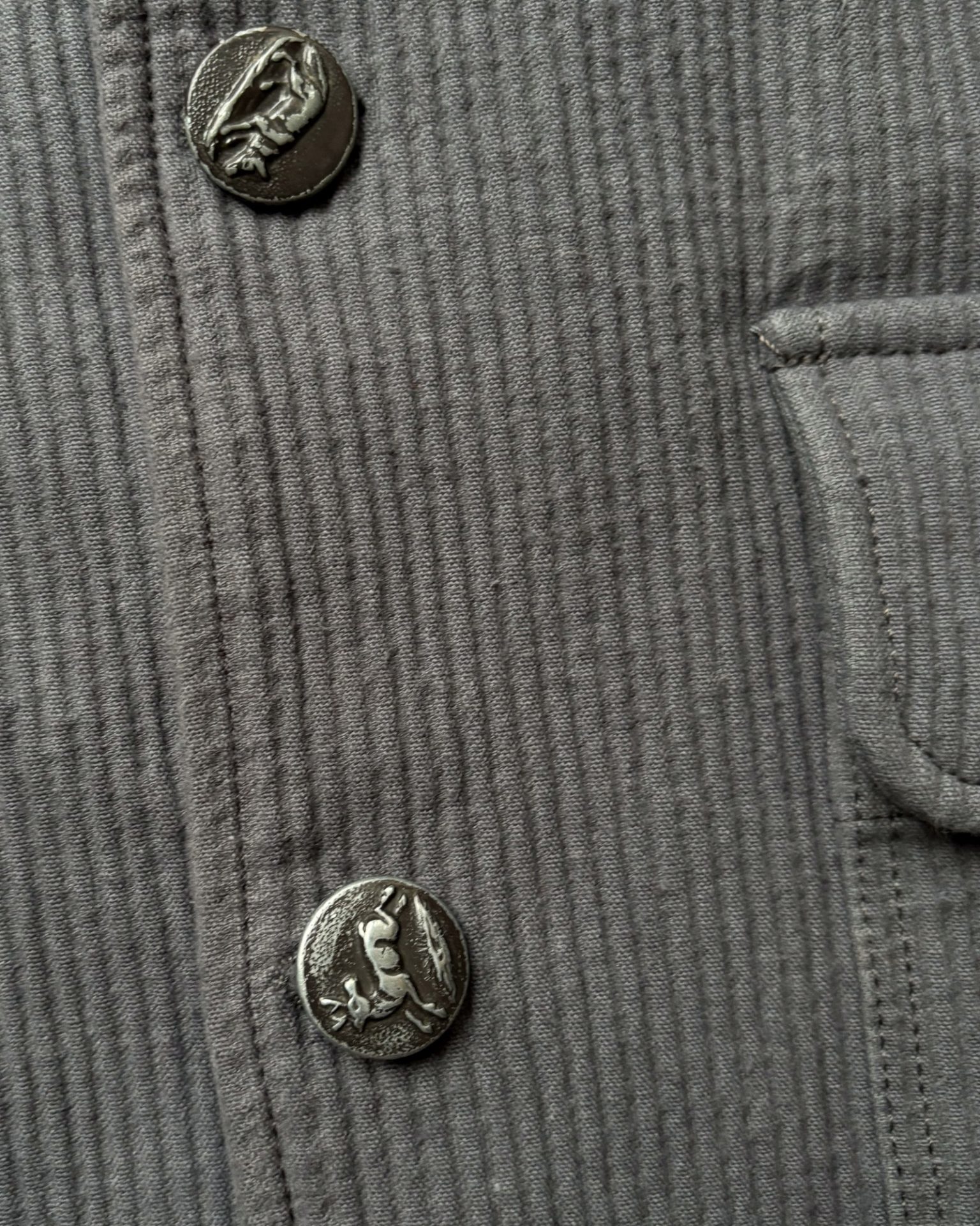 This series is made of new old stock grey cotton coutil made in Holland in the 1940s. The coutil has embossed stripes on the outer and a looped weave inside, but in this case is covered by a cotton lining. We used unpaired vintage French animal buttons which have an incredible patina.