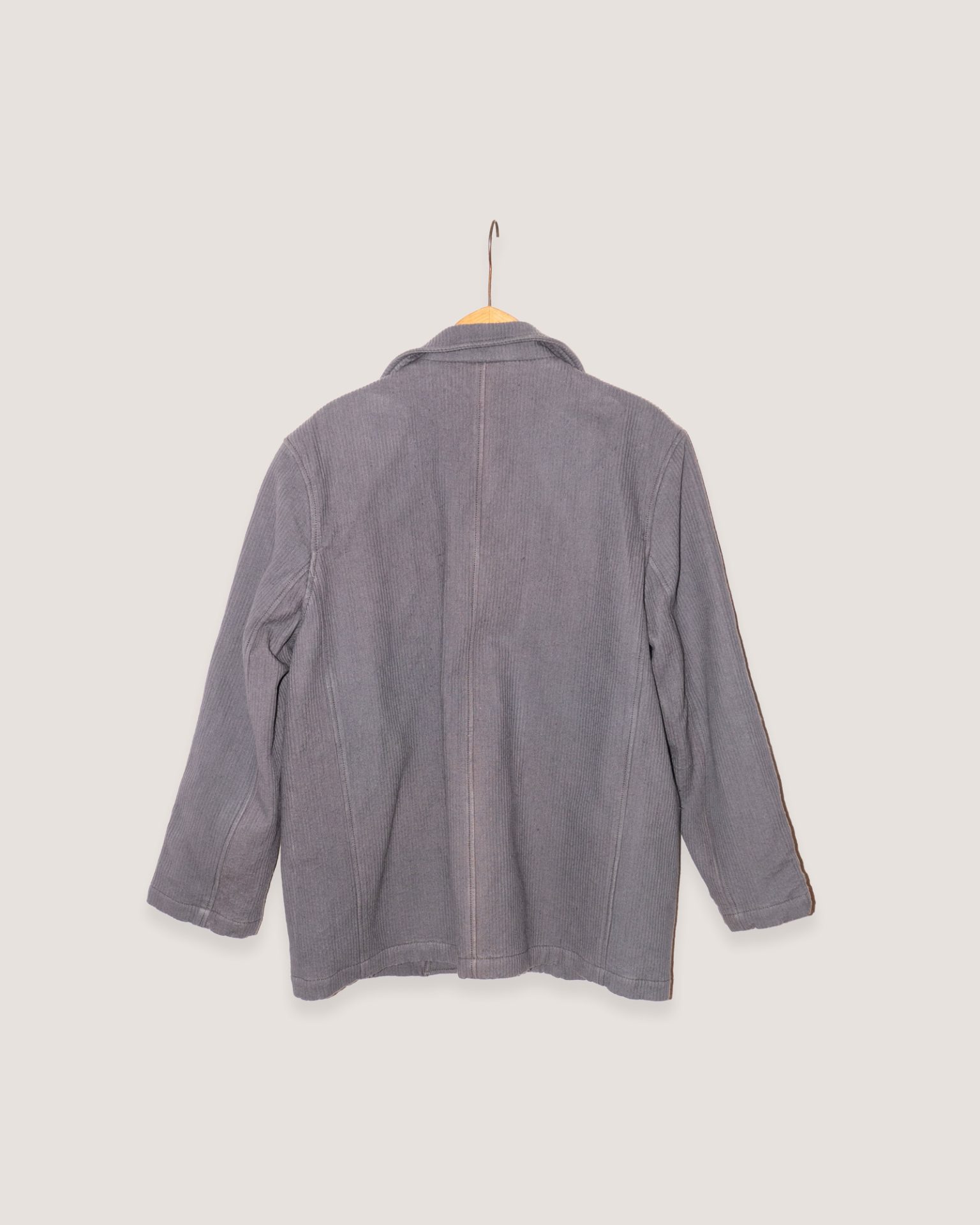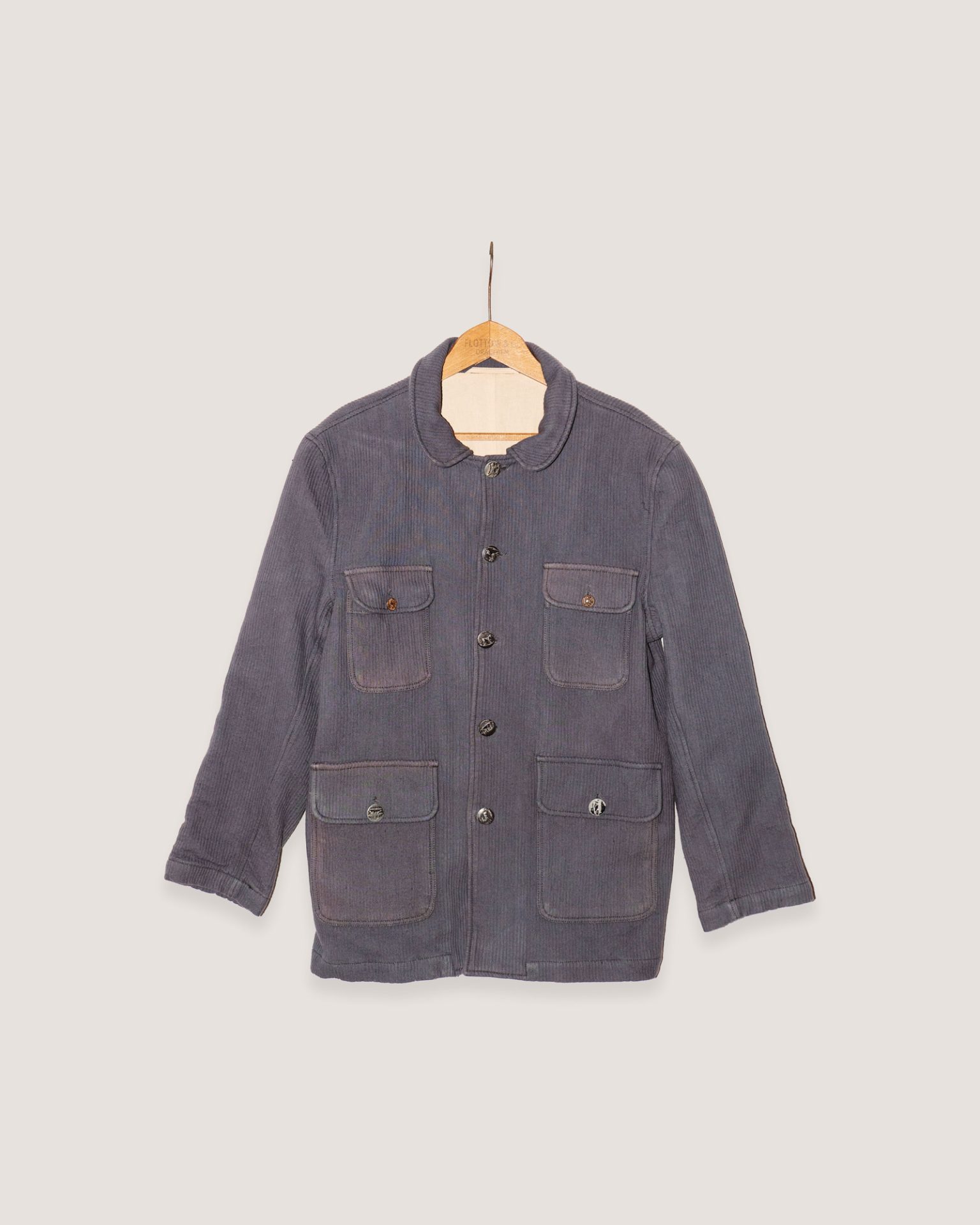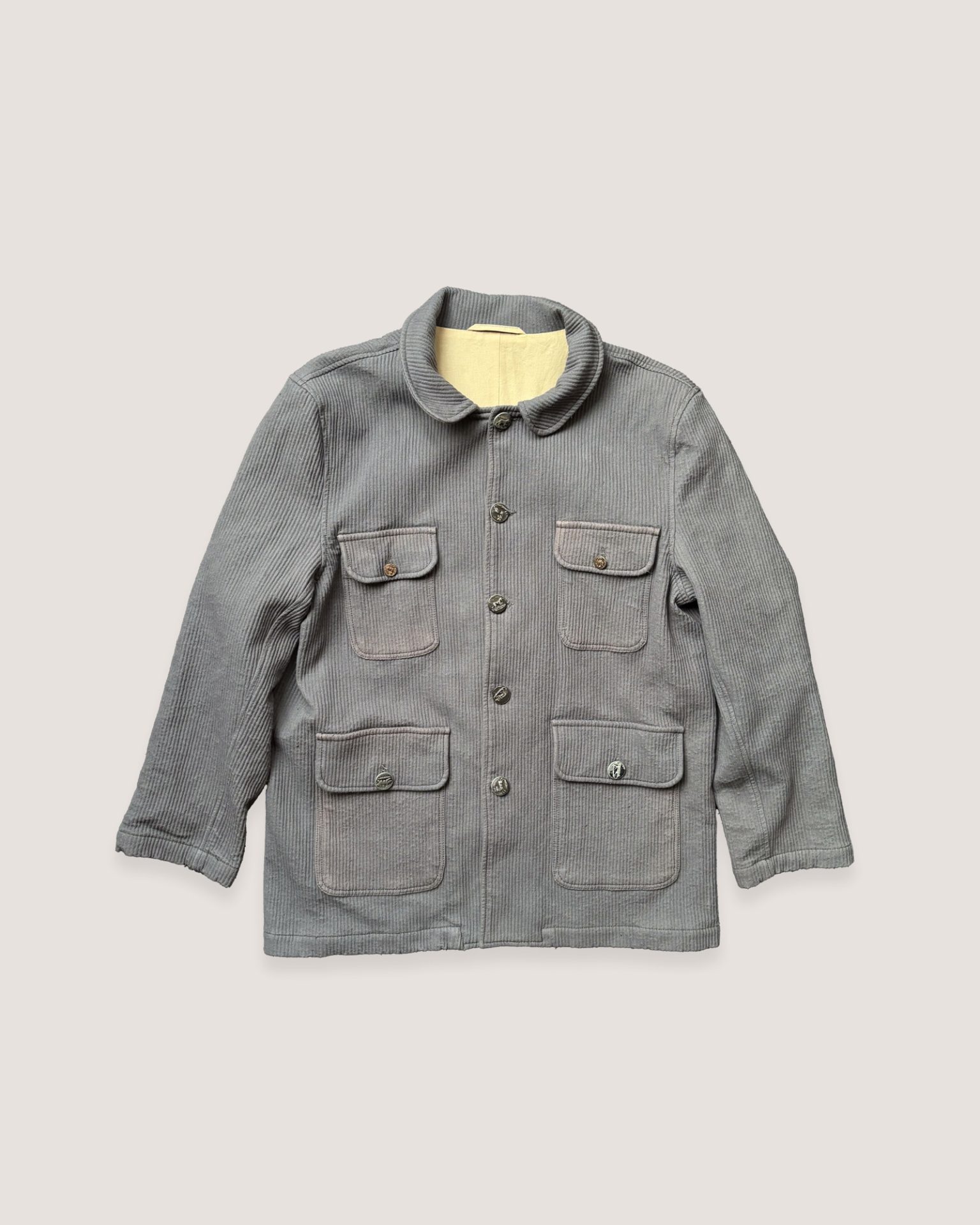This series is made of new old stock grey cotton coutil made in Holland in the 1940s. The coutil has embossed stripes on the outer and a looped weave inside, but in this case is covered by a cotton lining. We used unpaired vintage French animal buttons which have an incredible patina.